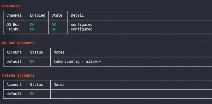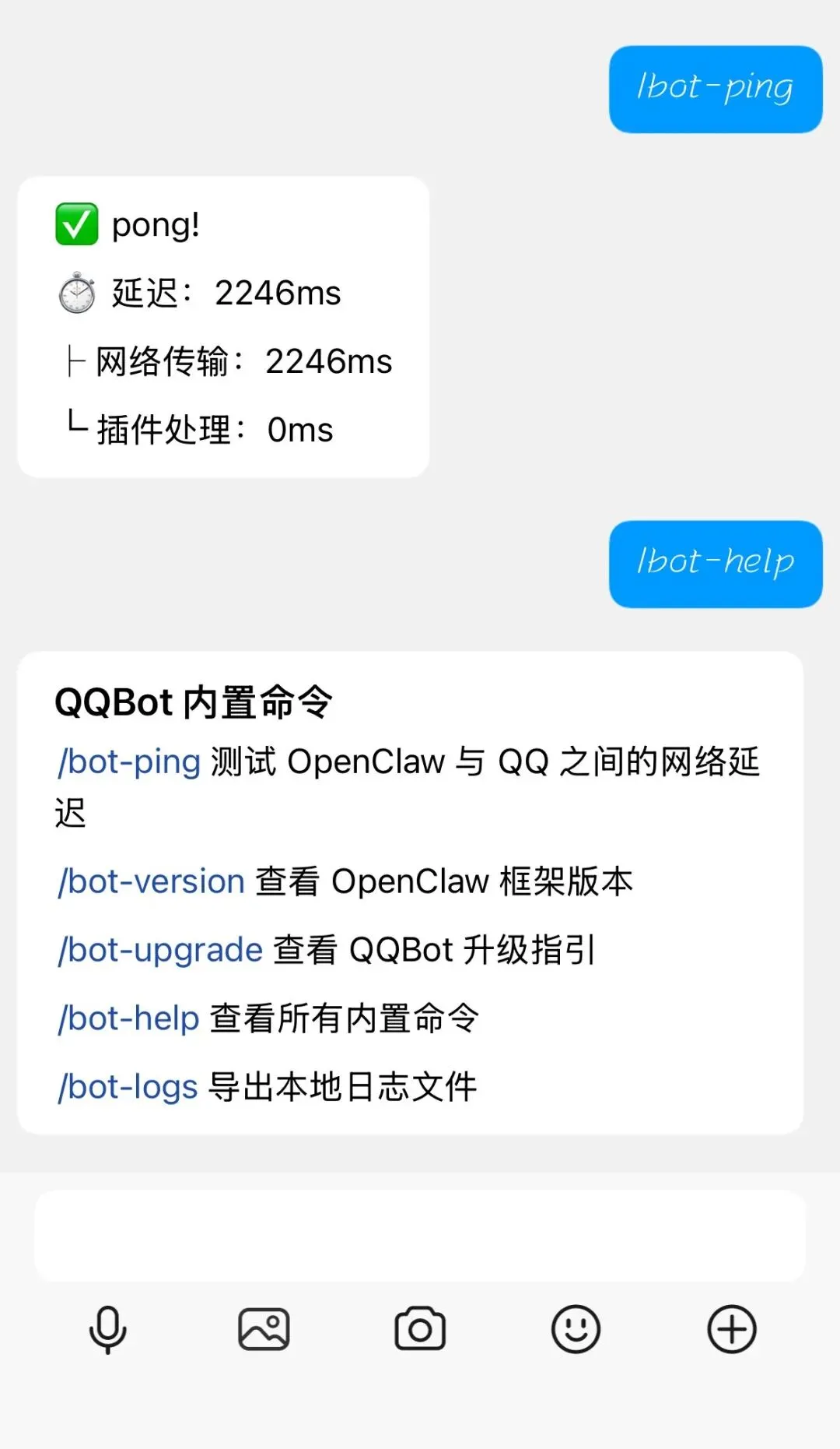 重启 Gateway 后,在qq消息列表里面和你的机器人对话,可以用内置命令测试: