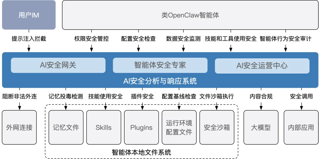 AI安全分析与响应系统是一套面向智能体全生命周期的智能安全管控平台,通过智能体安全专家、AI安全网关、AI安全运营中心等核心组件,从智能体应用环境安全评估、智能体运行时安全防护、智能体行为安全审计等方面,构建起覆盖事前评估、事中防护、事后追溯的闭环安全管理体系。依托云端协同的安全引擎,采用轻量化部署架构及AI原生交互设计,系统可对类OpenClaw智能体在系统、网络、数据、模型、应用等多维度的安全风险进行精准防护与统一管控,为toC/toB场景下的智能应用提供全链路安全护航。