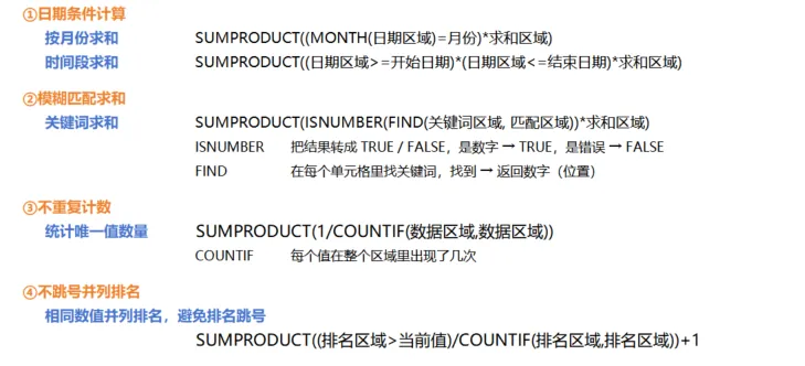 Excel 函数| SUMPRODUCT一个顶 N 个函数做数据分析的姐妹,SUMPRODUCT 真的是绕不开的神函数!多条件求和 / 计数、模糊匹配、去重计数… 一个函数全搞定,直接替代 SUMIF/SUMIFS,效率直接拉满💯📌 核心语法=SUMPRODUCT(数组1, [数组2], ...)✅ 对应元素相乘后求和✅ * 代表 AND(且),+ 代表 OR(或)✅ 逻辑值 TRUE/FALSE 自动转 1/0 参与计算1 作用 对多组同维度数组对应元素相乘后求和2 语法SUMPRODUCT(数组1, [数组2], [数组3], ...)每个参数为同维度区域 / 数组(行数、列数完全一致)。运算逻辑:对应位置元素相乘→累加所有乘积结果数值兼容:逗号分隔参数时,非数值(文本 / 逻辑值)自动转为 0 参与计算;用运算符(*、+)连接逻辑条件时,需先将 TRUE/FALSE 转为 1/0。3 例子4 补充进阶5 与SUMIFS差异对比维度SUMPRODUCTSUMIFS适用版本全版本通用Excel 2007+条件类型支持任意逻辑(AND/OR/仅支持 AND 逻辑,需嵌套多条件写法用 *(AND)、+(OR)多参数直接传入(仅动态适配支持数组公式,适配动态数需手动调整区域,适配性较上手难度稍高(需理解逻辑转换)简单(参数直接传入)