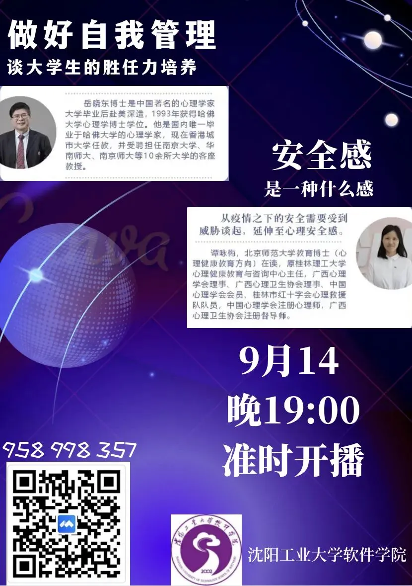 为促进学院心理健康教育工作更加优质高效地开展,充分发挥学生在心理健康教育工作中的主体作用,帮助新生更快适应新阶段。9月14日,软件学院举办“新阶段,心适应”心理系列讲座。讲座由香港城市大学岳晓东博士和北京师范大学教育博士(在读)谭咏梅主讲,学院心理委员和全体新生参加了讲座。