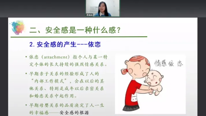 谭咏梅博士从疫情之下的全需要受到威胁谈起,延至心理安全感。着重介绍了安全感的来源、缺少安全感的体现,引导学生认识安全感的心理机制,对安全感的获得途径进行细致讲解指导。