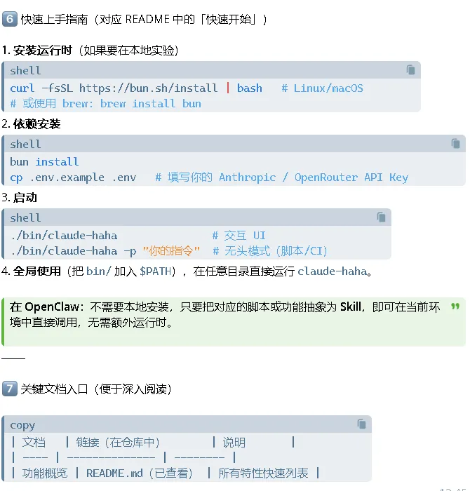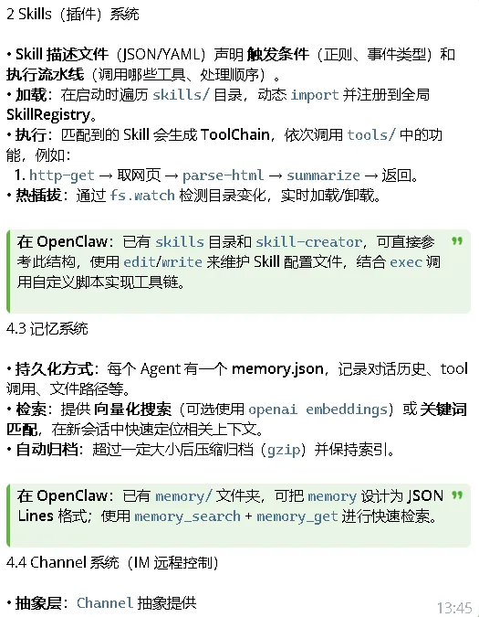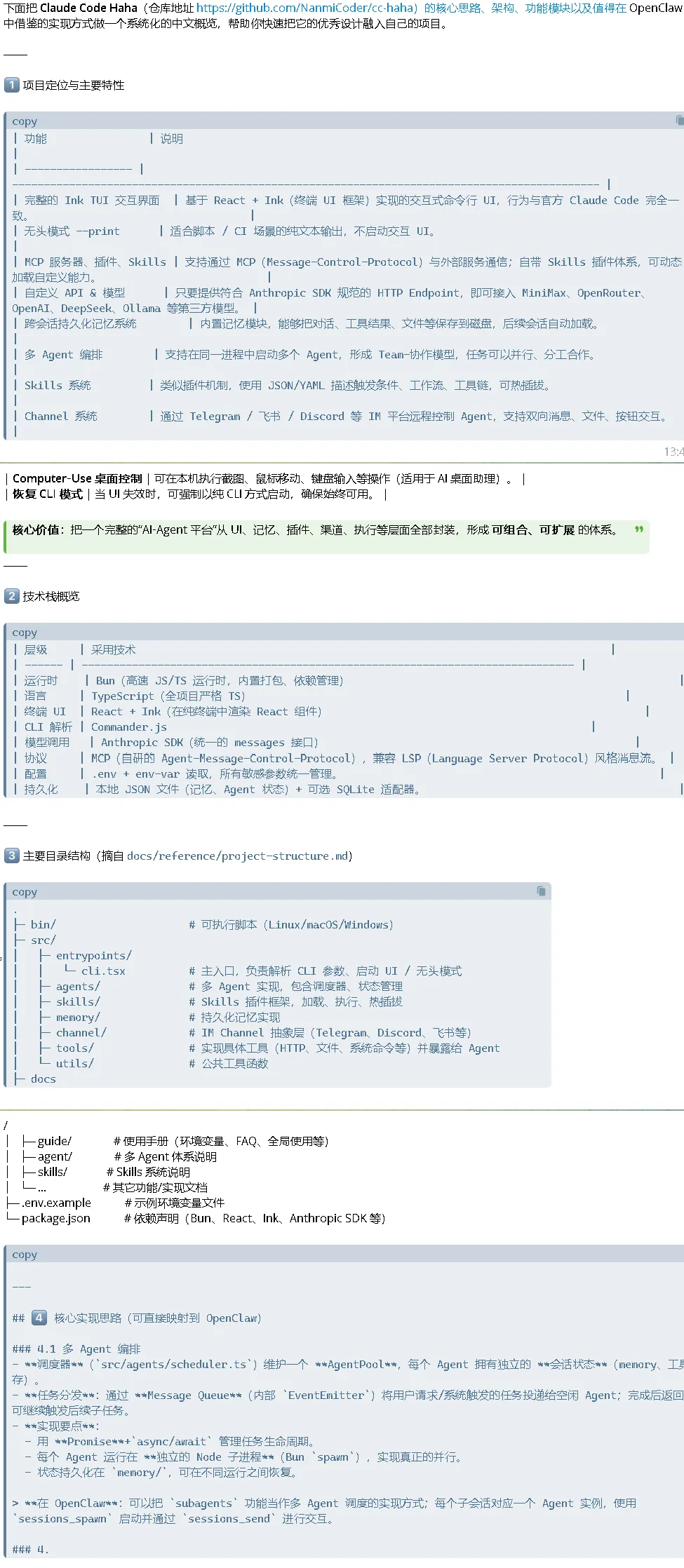 Openclaw的“自我进化”“小龙虾”OpenClaw 的技能(Skills)是预定义的工作流,指导 AI 如何组合使用各种工具来完成特定任务,可以理解为“AI 的自动化操作手册”。这些技能主要通过 ClawHub 这个官方技能市场来安装和管理。给它喂了一些skills后,发现它的速度变得快多了,思考也敏捷多了,记录下来。6、Agent Team Orchestration18、n8n/gog/github/pdf/docx/xlsx1、通过学习优秀代码https://github.com/NanmiCoder/cc-haha,它提炼成如下图的总结2、Claude Code Haha 把 多 Agent、插件化 Skills、持久化记忆、跨渠道控制 等高级能力打包成一个可直接本地运行的 CLI。这个你可以加进来吗?经过多项技能的加持和Claude Code代码的学习迁移,完成自身的进化,小龙虾应该是拥有了更加强大的能力,后面再进行测试一下。