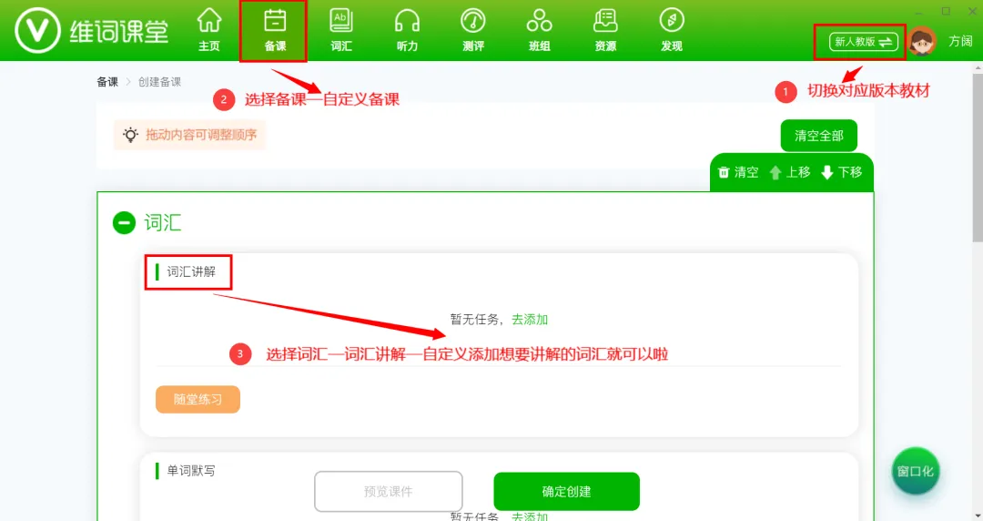 单词领读、默写模块老师可自由调节播放次数、间隔、英美式发音;另外有北大外语学院副教授燕翎老师指导发音,提示发音注意事项。