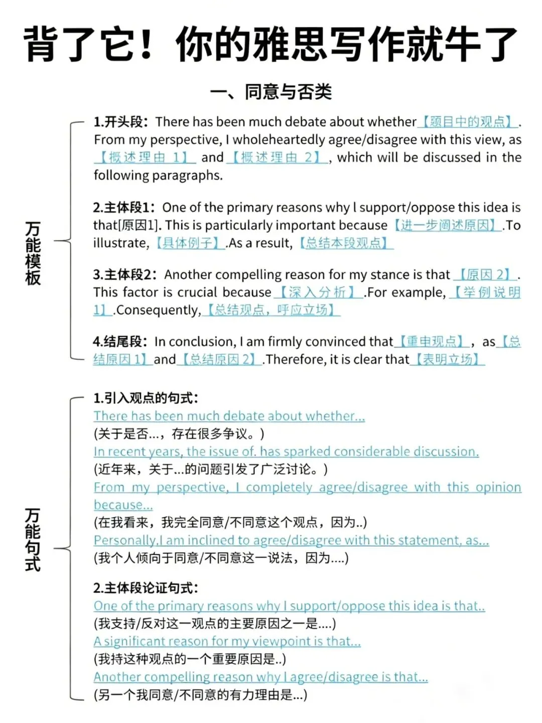 背会这套雅思写作模板,大作文直接开挂!很多同学一看到雅思大作文题目就大脑空白❌,要么逻辑混乱,要么结构松散,分数迟迟提不上来。其实雅思大作文就像搭积木🧱,掌握好 “搭建公式” 就能快速写出高分作文。这套万能模板主打清晰逻辑 + 实用结构,教育、社会、科技类话题都能直接套用,文章条理清晰、论证有力✅。建议大家按题型多练,灵活套用模板并填充观点和词汇,坚持练习,写作水平会明显提升!#雅思#雅思考试#雅思大作文#雅思备考#雅思写作#雅思攻略#雅思大作文模板#雅思写作模板#雅思写作素材#雅思大作文万能模板