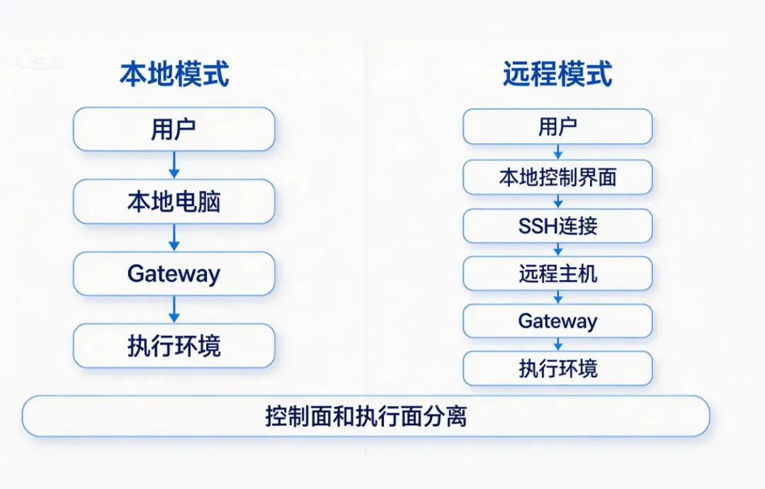 从技术设计上看,这意味着 OpenClaw 的“控制界面”和“执行环境”是可以分开的。