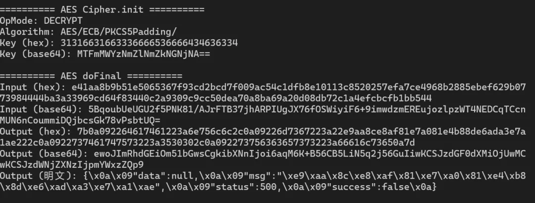 // aes_hook_decoded.jsJava.perform(function() {var Cipher = Java.use("javax.crypto.Cipher");var SecretKeySpec = Java.use("javax.crypto.spec.SecretKeySpec");Cipher.init.overload("int", "java.security.Key").implementation = function(opmode, key) {console.log("\n========== AES Cipher.init ==========");console.log("OpMode: " + (opmode == 1 ? "ENCRYPT" : "DECRYPT"));console.log("Algorithm: " + this.getAlgorithm());console.log("Key (hex): " + bytesToHex(key.getEncoded()));console.log("Key (base64): " + bytesToBase64(key.getEncoded()));return this.init(opmode, key);};Cipher.doFinal.overload("[B").implementation = function(data) {console.log("\n========== AES doFinal ==========");console.log("Input (hex): " + bytesToHex(data));console.log("Input (base64): " + bytesToBase64(data));var result = this.doFinal(data);console.log("Output (hex): " + bytesToHex(result));console.log("Output (base64): " + bytesToBase64(result));console.log("Output (明文): " + bytesToString(result));return result;};// 同时 Hook SecretKeySpecSecretKeySpec.$init.overload("[B", "java.lang.String").implementation = function(keyBytes, algorithm) {console.log("\n========== SecretKeySpec ==========");console.log("Algorithm: " + algorithm);console.log("Key (hex): " + bytesToHex(keyBytes));console.log("Key (base64): " + bytesToBase64(keyBytes));console.log("Key (明文): " + bytesToString(keyBytes));return this.$init(keyBytes, algorithm);};function bytesToHex(bytes) {var hex = "";for (var i = 0; i < bytes.length; i++) {hex += ("0" + (bytes[i] & 0xff).toString(16)).slice(-2);}return hex;}function bytesToBase64(bytes) {var base64 = "";var chars = "ABCDEFGHIJKLMNOPQRSTUVWXYZabcdefghijklmnopqrstuvwxyz0123456789+/";for (var i = 0; i < bytes.length; i += 3) {var b1 = bytes[i] & 0xff;var b2 = (i + 1 < bytes.length) ? bytes[i + 1] & 0xff : 0;var b3 = (i + 2 < bytes.length) ? bytes[i + 2] & 0xff : 0;base64 += chars[b1 >> 2];base64 += chars[((b1 & 0x03) << 4) | (b2 >> 4)];base64 += (i + 1 < bytes.length) ? chars[((b2 & 0x0f) << 2) | (b3 >> 6)] : "=";base64 += (i + 2 < bytes.length) ? chars[b3 & 0x3f] : "=";}return base64;}function bytesToString(bytes) {var str = "";for (var i = 0; i < bytes.length; i++) {var c = bytes[i] & 0xff;if (c >= 32 && c <= 126) {str += String.fromCharCode(c);} else if (c < 32) {str += "\\x" + ("0" + c.toString(16)).slice(-2);} else {str += "\\x" + c.toString(16);}}return str;}});