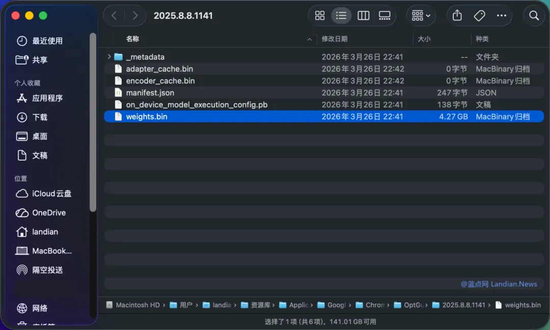 所以如果用户检查 Chrome 浏览器相关路径就会看到名为 weights.bin 的模型权重文件,而且似乎是无论用户是否使用都会被默认下载这个模型。