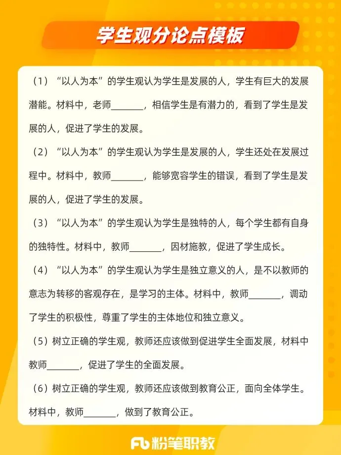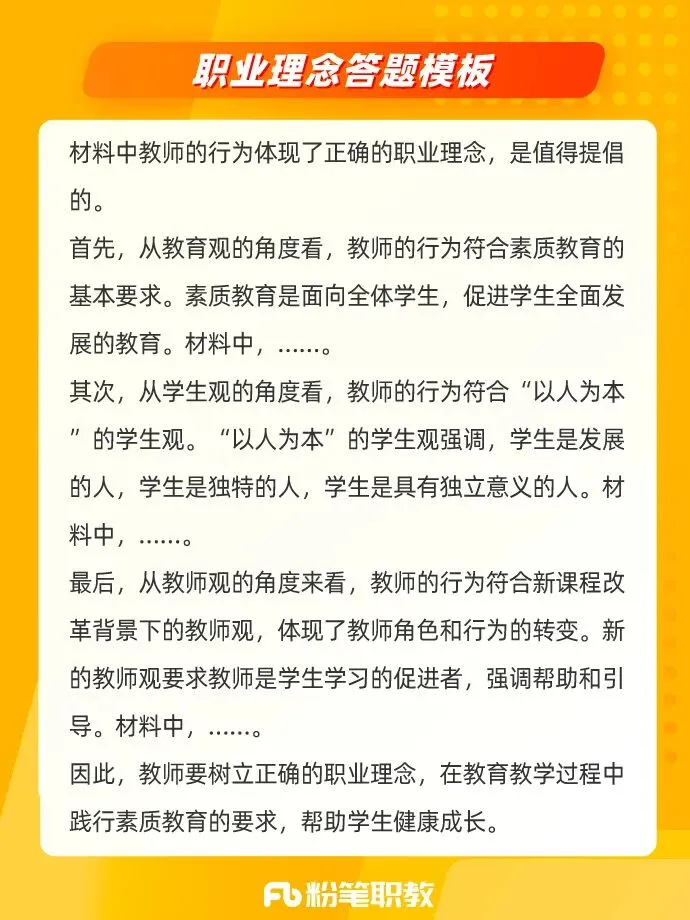 如果在题干中看到“请结合材料,从职业理念的角度,评析某某老师的教育行为”,就应该结合教育观、学生观、教师观的相关知识来回答。
