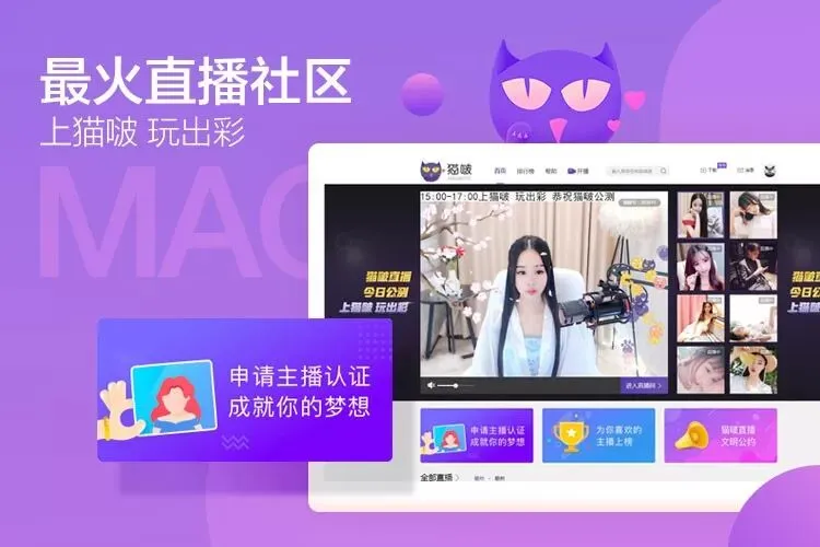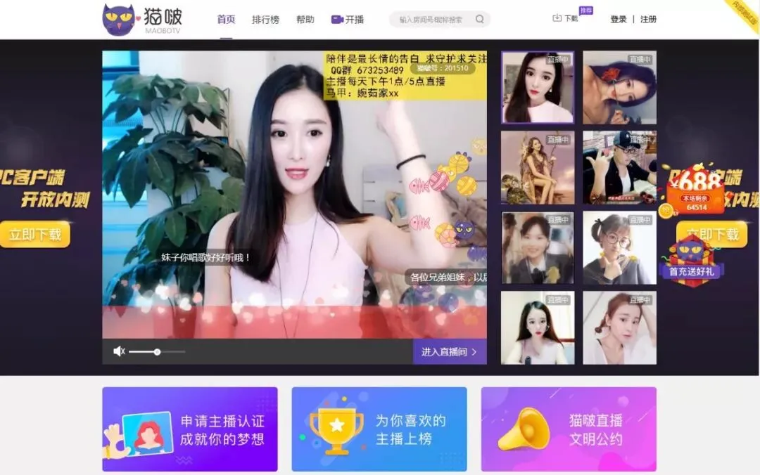 譬如,猫啵目前已吸引了直播行业中包括姿瓣、热度、华星、冰点、MJ等在内的数十家知名公会入驻。而花椒一姐徐若汐,来疯大主播兵子、裤衩、韩冷先生,奇秀大主播吴所谓和陌路,红豆等主播也纷纷成为了“猫啵”的头部大主播。可以说,这种带优质家族公会和头部主播一起在PC上“撩”用户的做法,让猫啵相当于含着金汤匙出生,甫一出世就身手不凡。