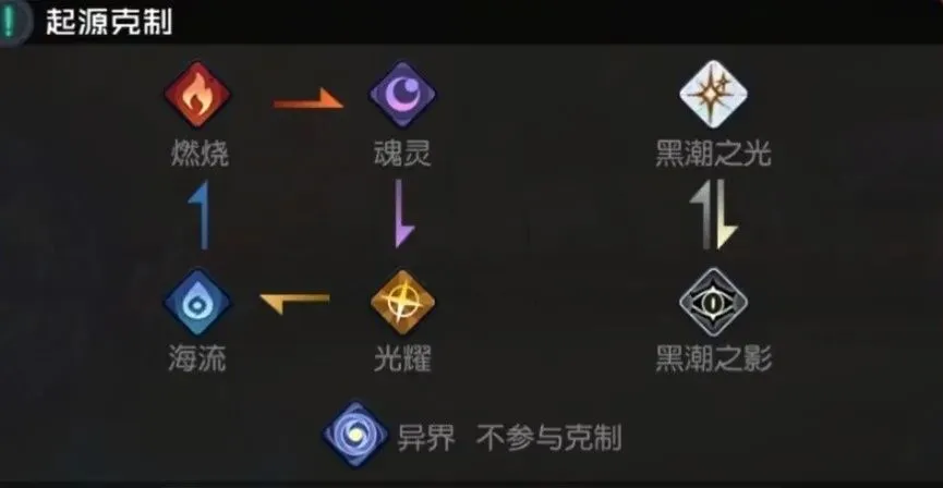 其三,游戏角色彼此的克制关系;游戏角色有着燃烧、海流、魂灵、光耀、黑潮之光、黑潮之影、异界共七种不同的起源属性,如何五行一般,彼此间存有相互克制的关系,从而产生了不同的阵容体系。