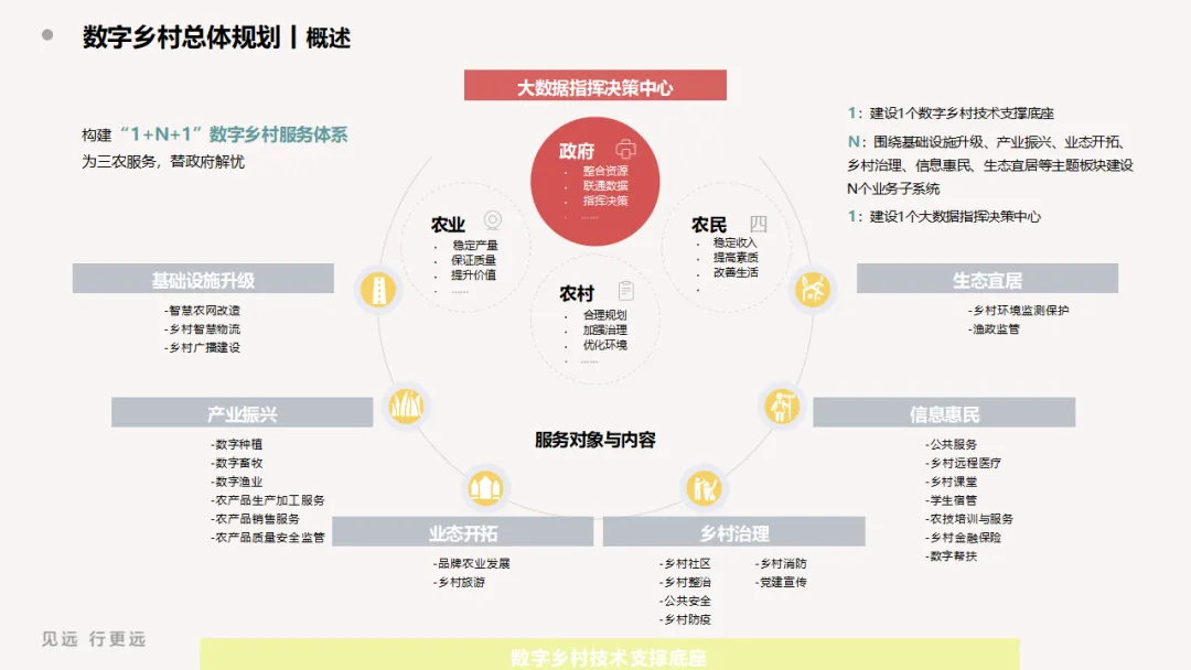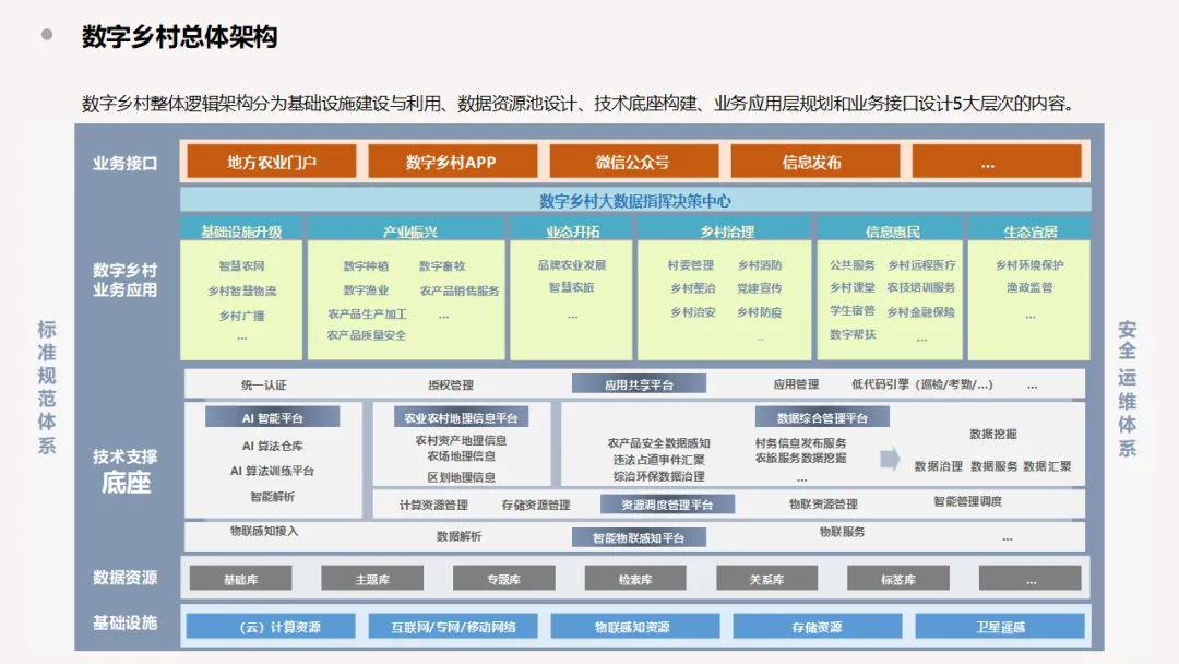本方案紧扣乡村振兴与数字中国战略,以“1+N+1”总体架构为核心,构建覆盖基础设施、产业、治理、服务、生态的一体化数字乡村体系,助力农业农村现代化与城乡融合发展。 方案以数字乡村技术支撑底座为基础,整合云计算、物联网、大数据、AI与地理信息平台,实现多源数据统一接入、治理、调度与共享。依托统一技术底座,围绕基础设施升级、产业振兴、业态开拓、乡村治理、信息惠民、生态宜居六大板块,打造数字种植、数字畜牧、智慧农旅、智慧物流、远程医疗、乡村课堂、乡村消防、环境监测、渔政监管等全场景应用,形成可复制、可扩展的数字乡村业务闭环。 在建设模式上,坚持统一平台、统一部署、统一标准、统一运营,打通数据孤岛,避免重复建设,通过大数据指挥决策中心实现乡村态势一屏统览、事件一键调度、决策一图支撑。方案聚焦农业生产智能化、经营网络化、管理高效化、服务便捷化,有效缩小城乡数字鸿沟,提升农民数字素养与乡村治理效能。 本方案兼顾实用性与前瞻性,适配不同区域乡村发展基础,可快速落地实施,全面助力数字技术赋能农业增效、农村增美、农民增收,为乡村全面振兴提供坚实数字支撑。