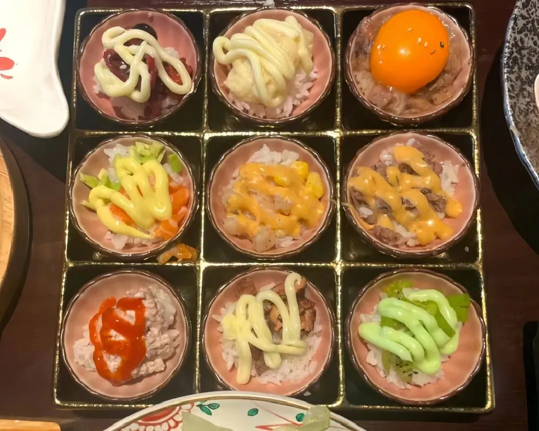 美食简介:一番酒场-日本料理 九宫格一口饭。这道菜光是看起来就让人眼前一亮啦!其中包括了牛油果三文鱼、炙烤鹅肝、黑椒虾仁、黑椒牛舌、藤椒牛肉、奶香榴莲、奇异果酱、黑椒脑花和味付八爪鱼九种不同的搭配,每一格都可以带来不一样的味觉体验!新鲜的食材淋上不同的酱料,再吃上一口清爽解腻的米饭,一个字—香!