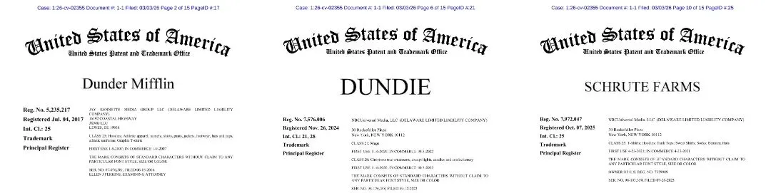 NBC环球主要针对其热门美剧《办公室》(The Office)的商标进行维权,包括剧中虚构公司“Dunder Mifflin”以及“Dundie”、“Schrute Farms”等。相关周边商品如T恤、贴纸、手机壳、马克杯等都是侵权的高发区