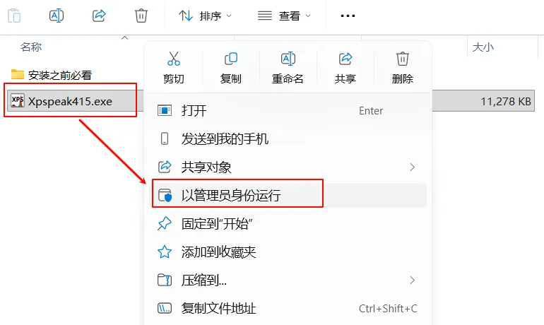 2、选中“Xpspeak415.exe”右键以管理员身份运行