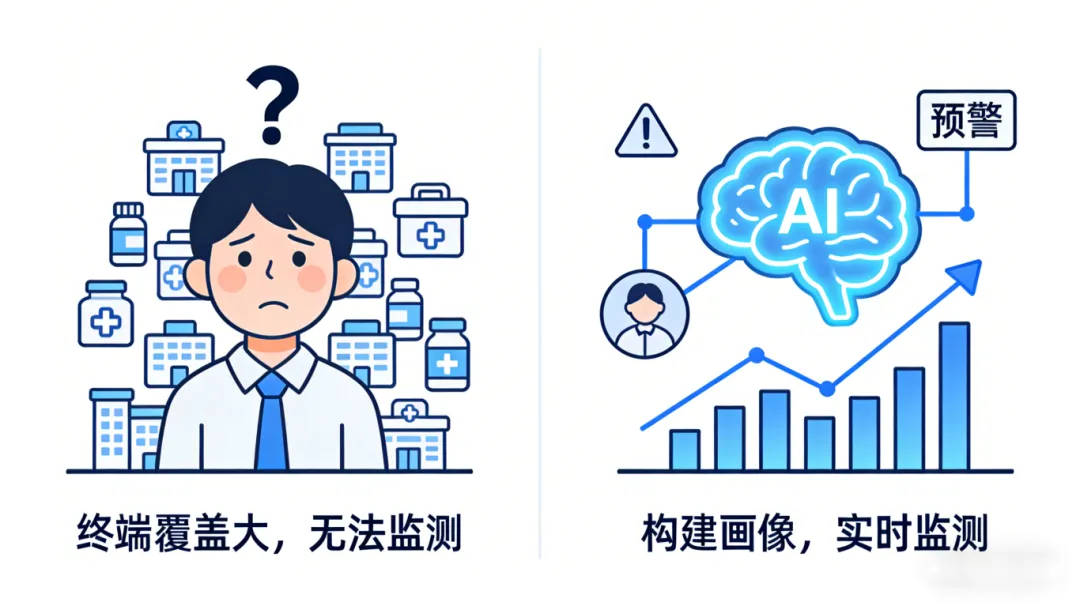 药企终端(医院/药店)覆盖基数大,基层医院采购情况无法跟进,大三甲重复投入资源;药品成功入院了,但是没办法保证持续采购。
