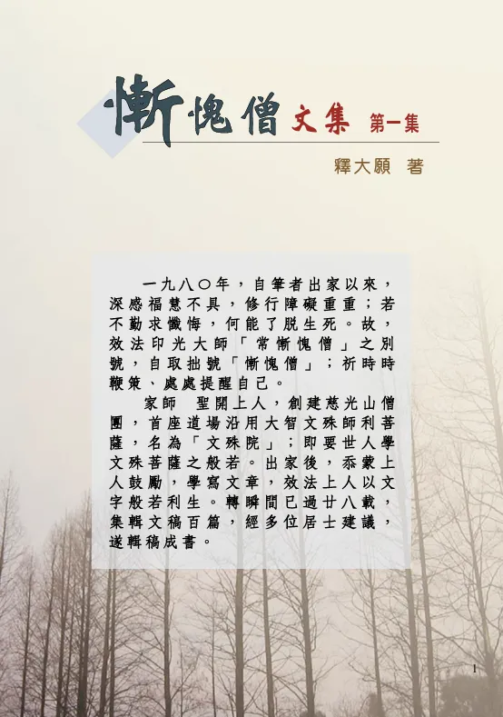 法師為人淳良,性格敦厚,勵志續承老和尚弘揚人乘佛教之大願,常以師志為己志,以師心為己心,讓慈光山僧團在平穩發展中,領導四眾弟子繼續推行淨化人心之志業。法師經年為法務繁忙,不遺餘力,除講經說法外,並著有《禪門宗風》第一、二集,《舍利與肉身》,《中國佛寺巡禮》第一、二、三集,《慚愧僧文集》第一、二、三、四集,《淨土宗十三祖》,《天台宗諸祖》,《重走江湖》,《行腳大陸》,《佛塔與祖塔》第一、二集,《江西黃梅行》等書。。