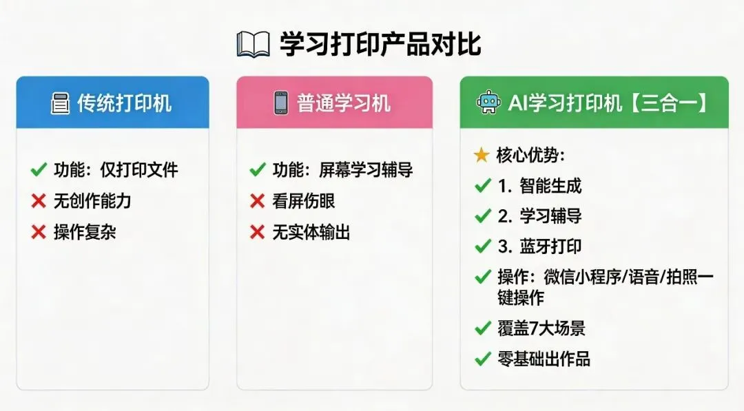 幼儿园要涂色手工,小学要单词卡片,初中要整理错题,高中要知识点总结……传统打印机只能打印固定文件,学习机只能盯着屏幕看。现在,智能学习+实体打印才是带娃新方向!把数字内容变成孩子能摸能学能玩的东西,这才是家长真正需要的!