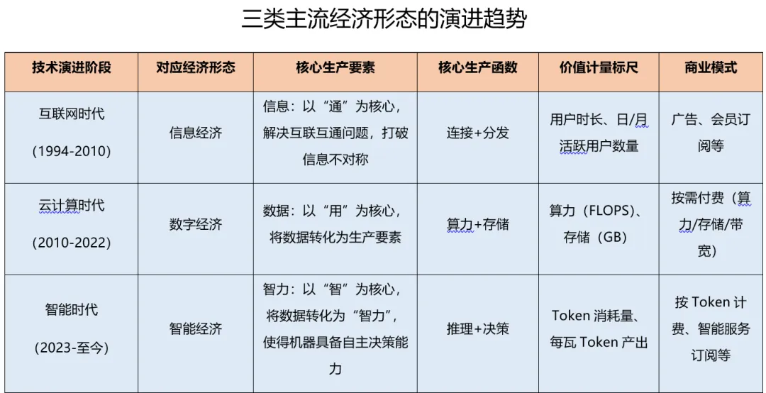 2026年,全国两会将“打造智能经济新形态”首次写入政府工作报告。智能经济是以数据+算力+算法等智力要素为驱动力的新型经济形态,在经历互联网时代、云计算时代的技术演进后,实现从连接到存算到决策、从信息化到数字化到自动化的范式转换,更是将输入输出的交互界面和价值标尺从以资源为中心,转换为以Token为中心。