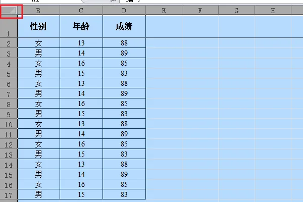 3、取消隐藏A列需要先将整个表格选中,点击左上角的按钮即可全选。