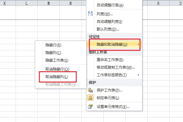 5、在下拉菜单中点击隐藏和取消隐藏,再点击取消隐藏列。