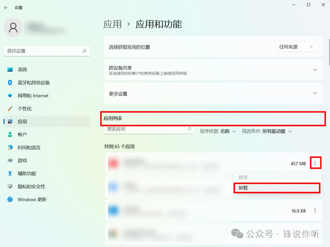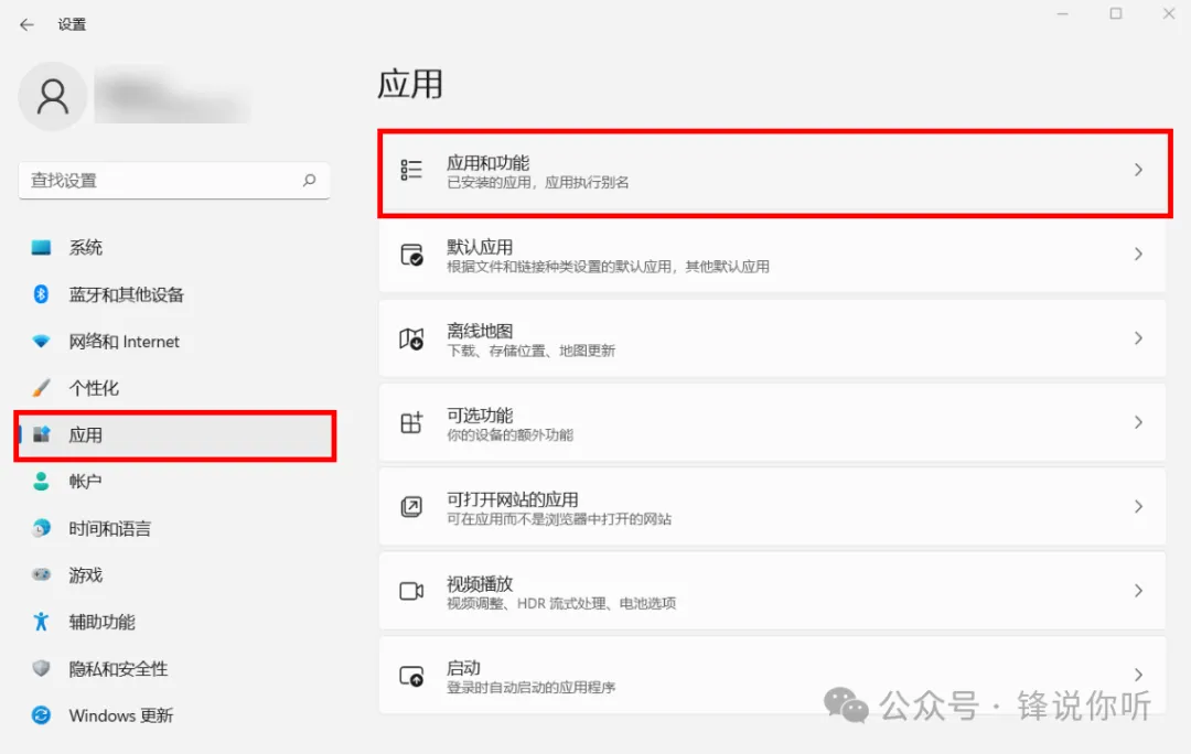 ,选择应用 > 应用和功能。(Windows11:点击 Windows 图标