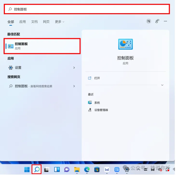 在桌面任务栏搜索框,输入控制面板,在搜索结果中点击控制面板并打开。