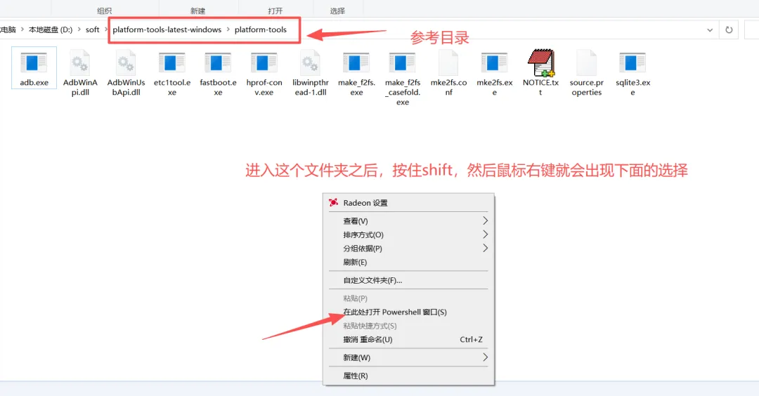 下载ADB工具之后,解压,进入解压之后的文件夹。然后按住shift再鼠标右键,即可选择“在此处打开PowerShell窗口”