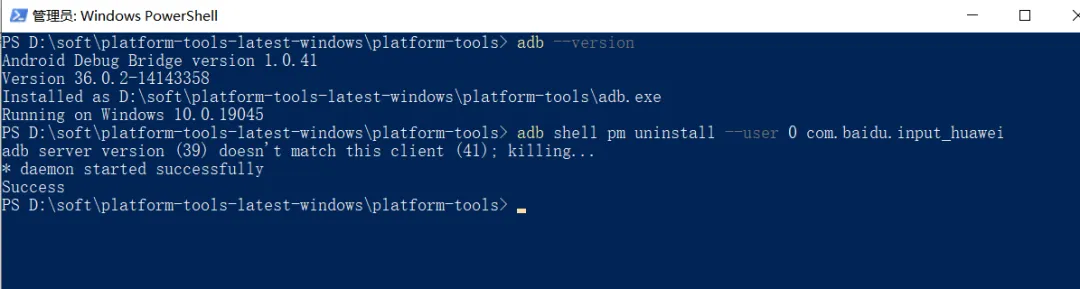 2、输入卸载百度输入法的命令,回车,出现success就说明卸载成功。