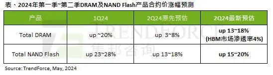 2024年第一季度,内存芯片合约价格上涨了多达20%,原本预计二季度会小幅上涨3-8%,但是集邦咨询最新修正为13-18%。