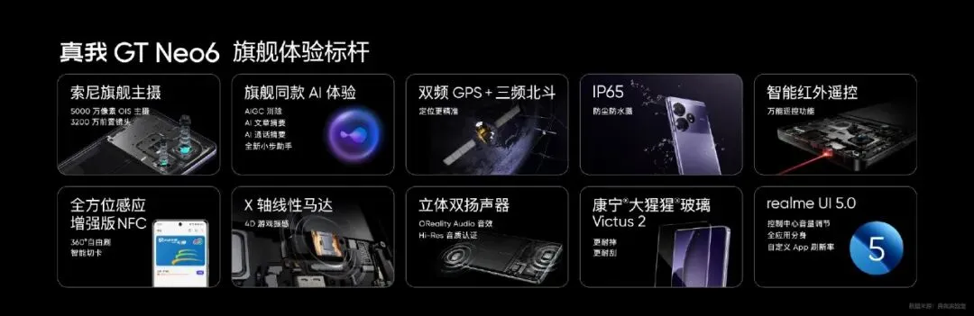- 其他:厚 8.65mm,重 191g,提供流银骑士、苍野骇客、灵犀紫 3 款配色,X 轴线性马达,支持 NFC、红外遥控,Wi-Fi 6 增强版,蓝牙 5.3,双频 GPS + 三频北斗,杜比全景声双扬声器,IP65 防尘防水认证,搭载 realme UI 5.0,首发 AI 燃模式。