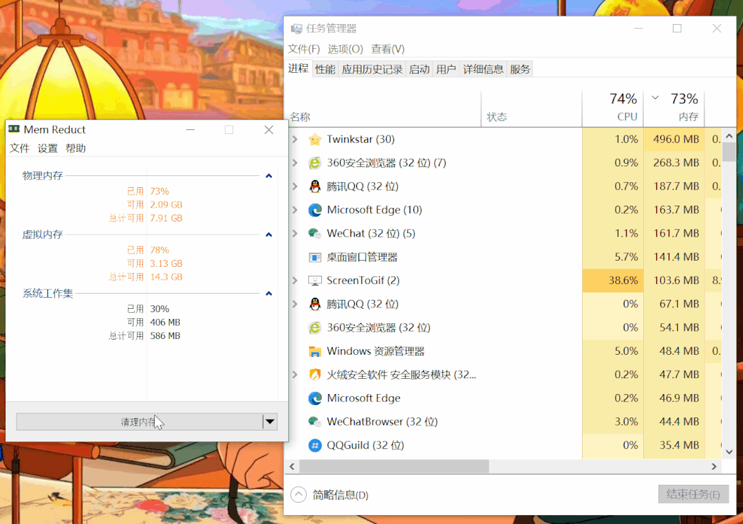 打开神器清理内存,可以看到电脑会以肉眼可见的速度释放出10%~50%的无用内存。