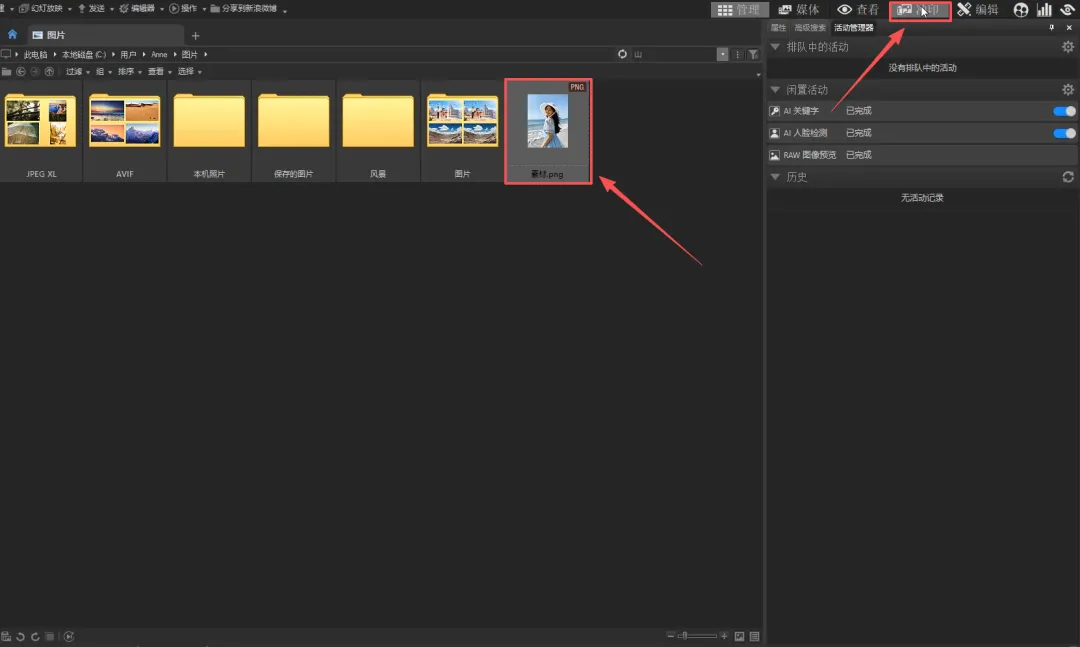 打开ACDSee 旗舰版软件,选中素材图片,点击右上角的“冲印”,进入软件的“冲印”模式。