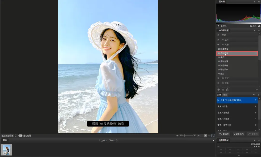 展开冲印预设值里的“AI人像”组,点击“AI皮肤提亮”预设。