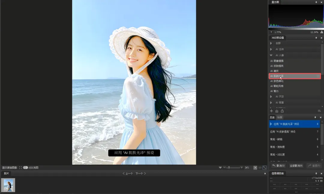 点击冲印预设值里的“AI人像”组中的“AI肌肤光泽”预设。