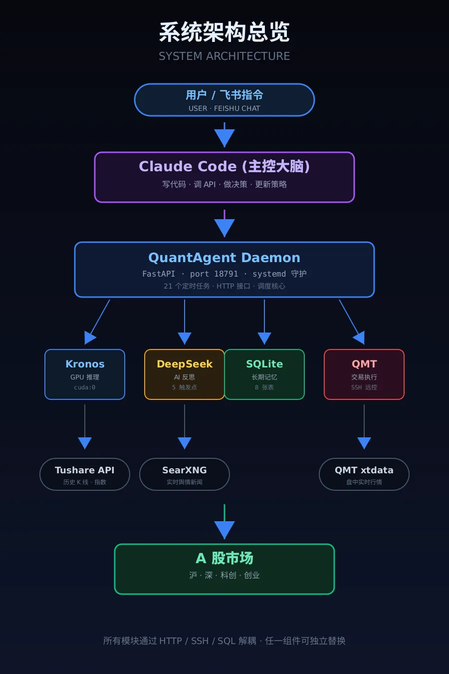 图 1 · 系统架构总览。Claude Code 是真正写代码 / 改策略的人, QuantAgent 是 24 小时跑在服务器上的守护进程。