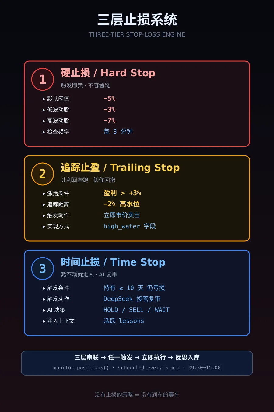 图 3 · 三层止损系统。 硬止损是底线, 追踪止盈是利润保护伞, 时间止损是给"温水煮青蛙"行情的解药。