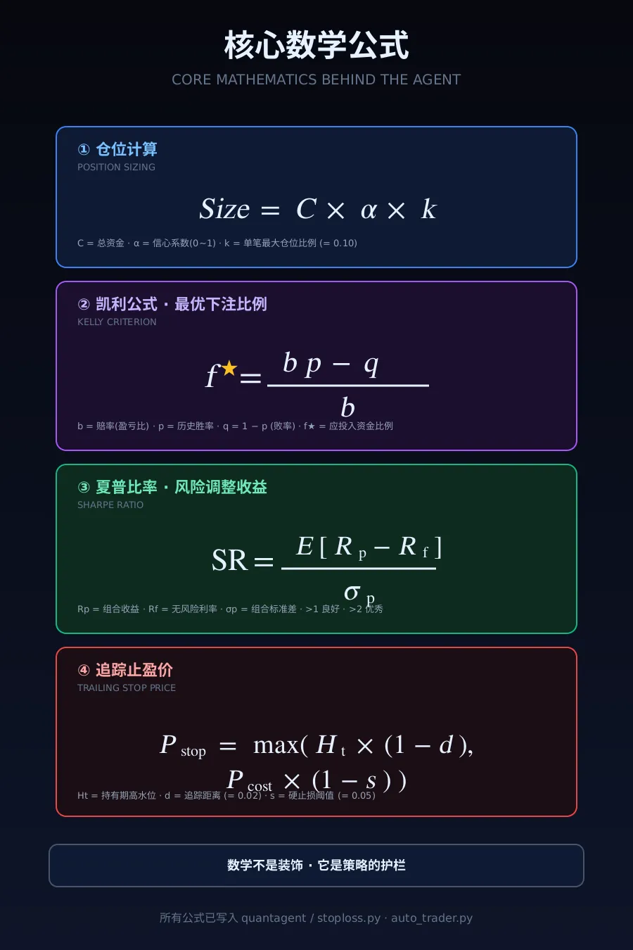 凯利公式告诉你"该下多大注", 夏普比率告诉你"这套策略到底好不好", 仓位公式控制单笔风险, 追踪止盈公式锁住已实现的优势。
