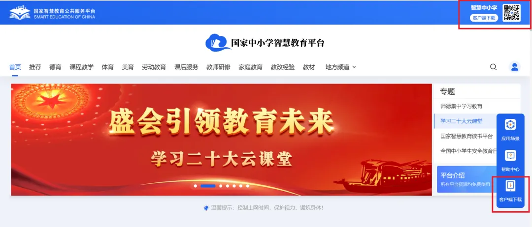 第一步:进入国家中小学智慧教育平台 (basic.smartedu.cn),选择页面右上角的“智慧中小学”客户端下载或者侧边栏的客户端下载。