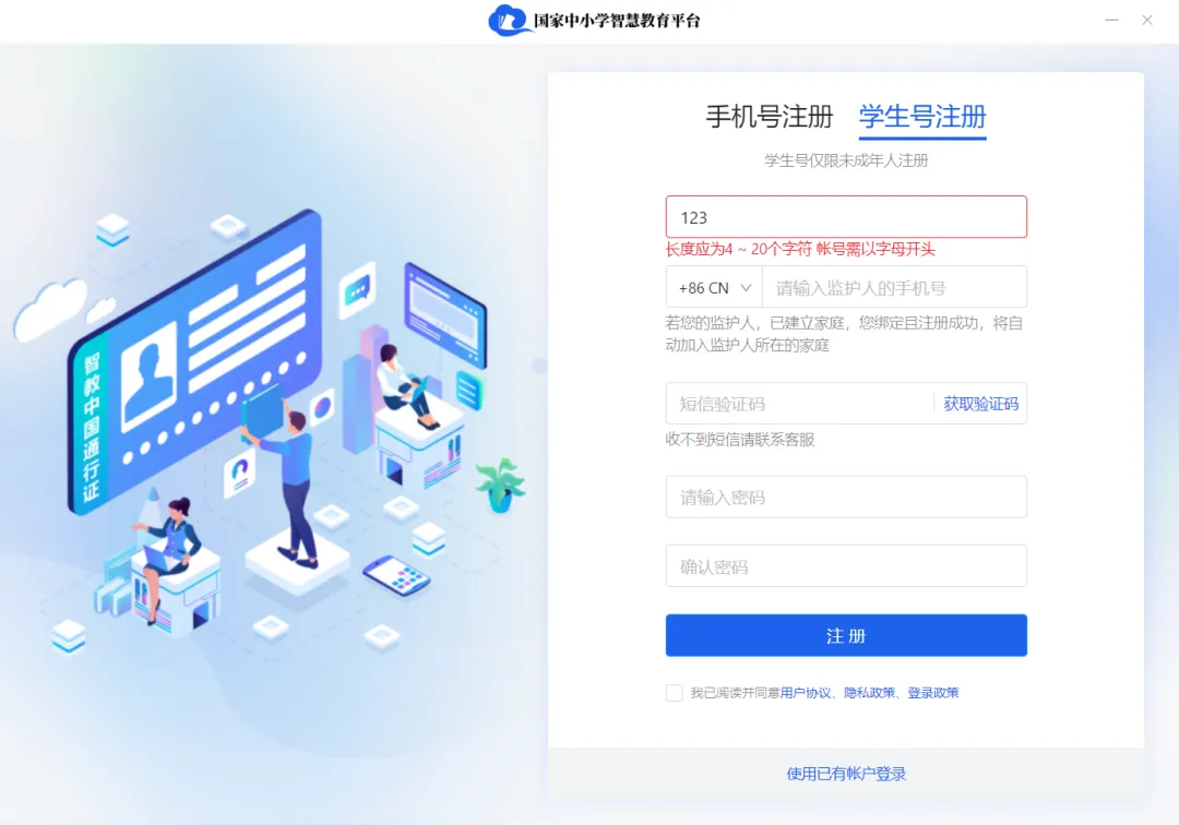 学生:学生可以按照图片所示的规则自拟学生号,并绑定家长手机号完成注册。