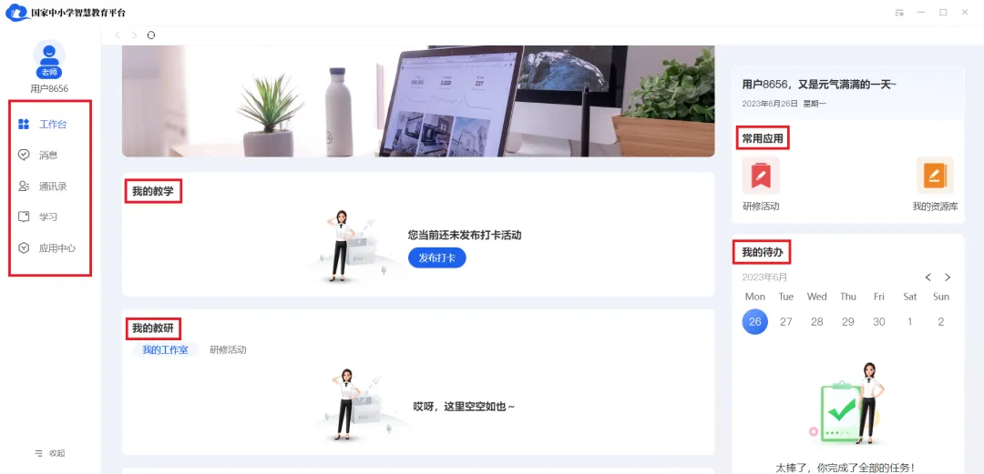 “智慧中小学”PC端可以展示工作学习内容,查看待办事项的提醒,极大地方便了教师的日常教育教学工作以及家长和学生的日常学习使用。