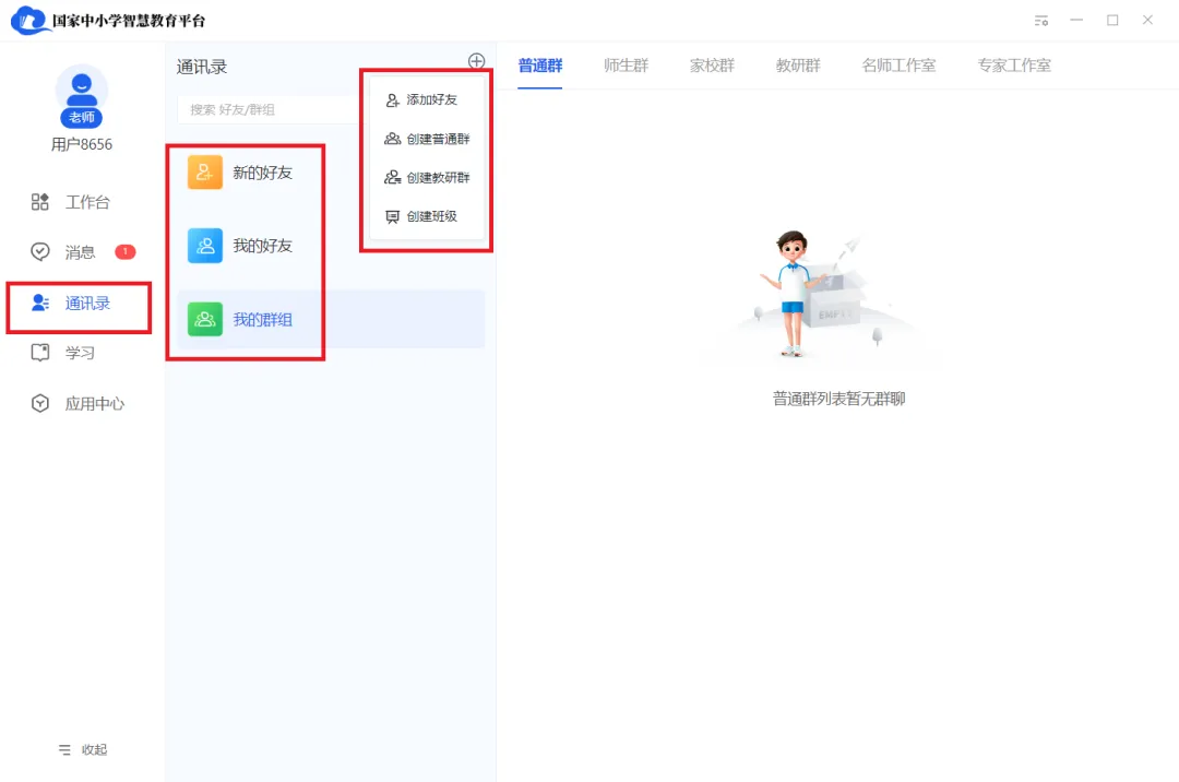通过点击左侧的主要功能栏中的“通讯录”按钮,可以进入通讯录界面,完成“添加好友或群组、创建班级、查看已添加好友或各群组”的操作。