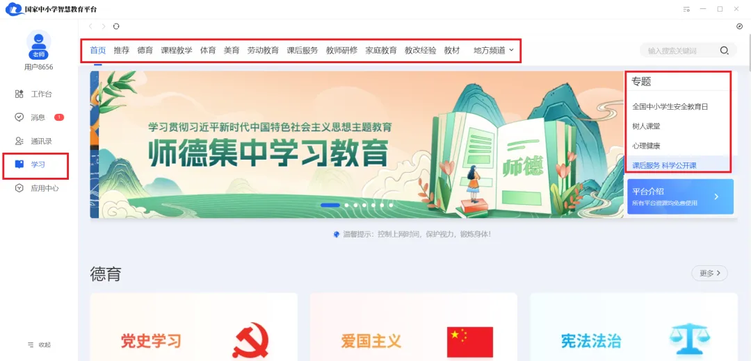 通过点击左侧的主要功能栏中的“学习”按钮,可以进入学习界面,进行课程教学、课后服务、教师研修等板块的学习,同时可以查看各项专题活动。
