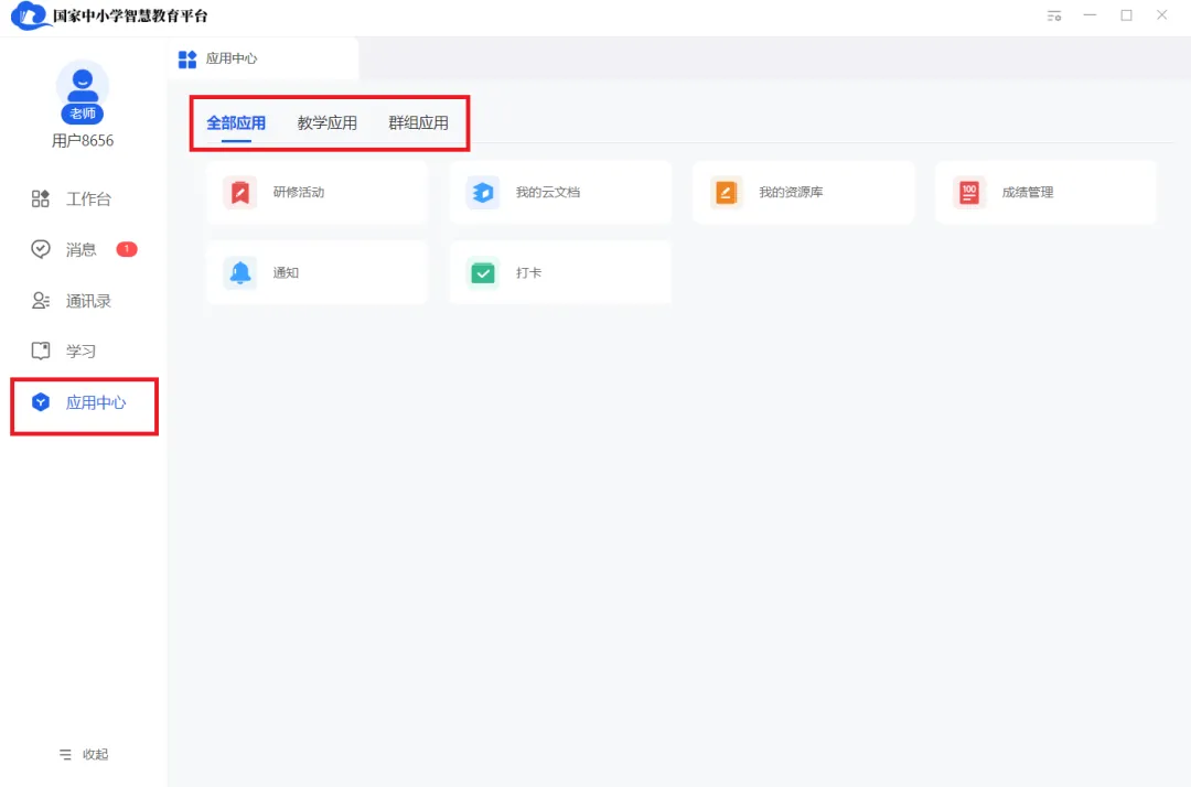 通过点击左侧的主要功能栏中的“应用中心”按钮,可以进入应用中心界面,查看并进入教学应用或者群组应用。
