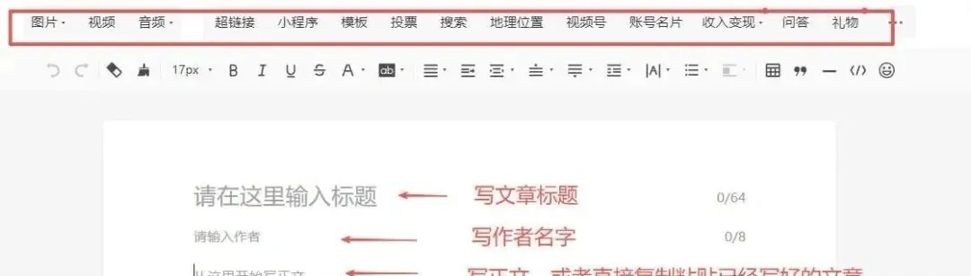 正文可以直接在编辑框里写,也可以先在Word、备忘录里写好,复制粘贴过来再排版。编辑框上方的工具栏,就是用来排版的(比如调字体、加颜色、分段),下方的空白区域,就是我们要填写的文章内容,新手可以慢慢摸索排版工具,多试几次就熟练了。