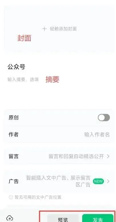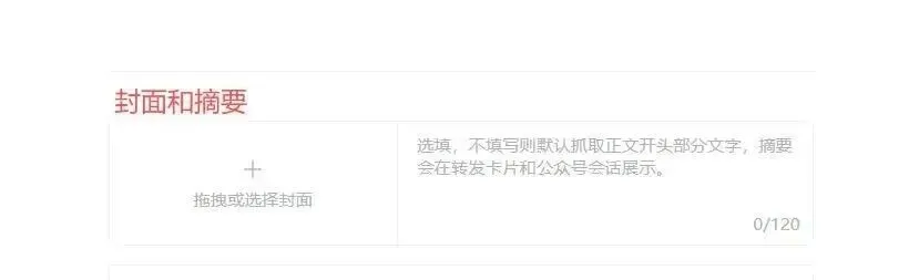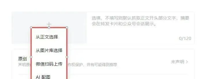 文章写好、排版完成后,就该设置封面和摘要了。摘要建议控制在120字以内,不用太复杂,要么概括一下文章的核心内容,要么摘一段文中有意思的句子,不想写的话也可以不填,不影响发布。