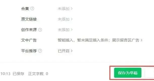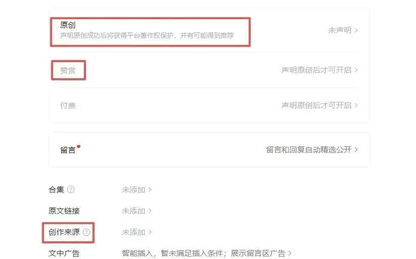 这里重点说一下这几个选项的注意事项:开启「原创声明」能提高文章的曝光量,但这个功能不是一开始就有的,需要先发表3篇文章才能开通;「赞赏」功能更简单,开通原创之后就能申请,不过要提前设置好赞赏账户,而且勾选赞赏时,账户名要和公众号名称保持一致,不然会无法生效。