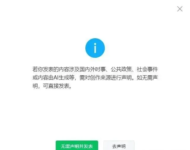 如果不需要声明原创(还没开通或者不想声明),就点击「无需声明并发表」,然后用绑定公众号的微信再次扫码确认,点击「发布」,文章就成功推送啦!