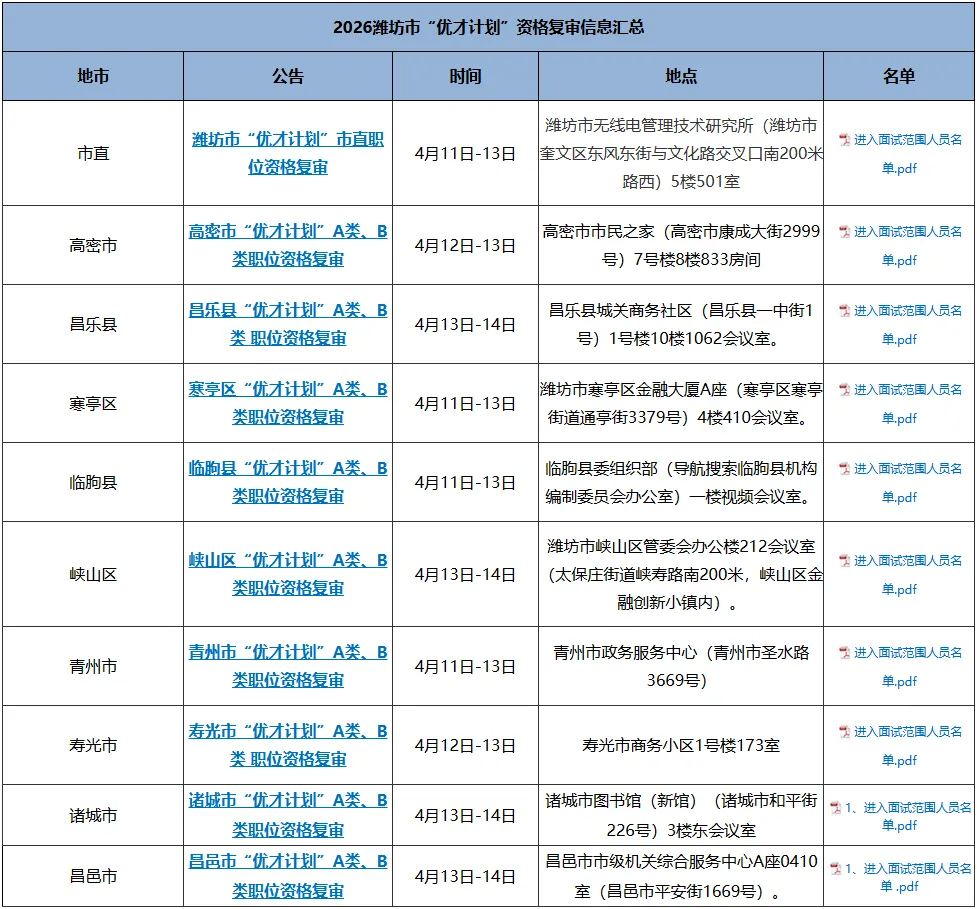 2026潍坊市“优才计划”资格复审信息汇总