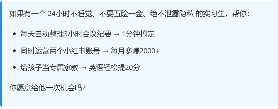 想做副业账号,熬大半夜出一篇内容,发出去石沉大海;上班被杂活填满,整理资料、做报表占了 80% 精力,准点下班都难;做私域、开小店,没预算雇运营,自己忙到连轴转,效果却微乎其微。
