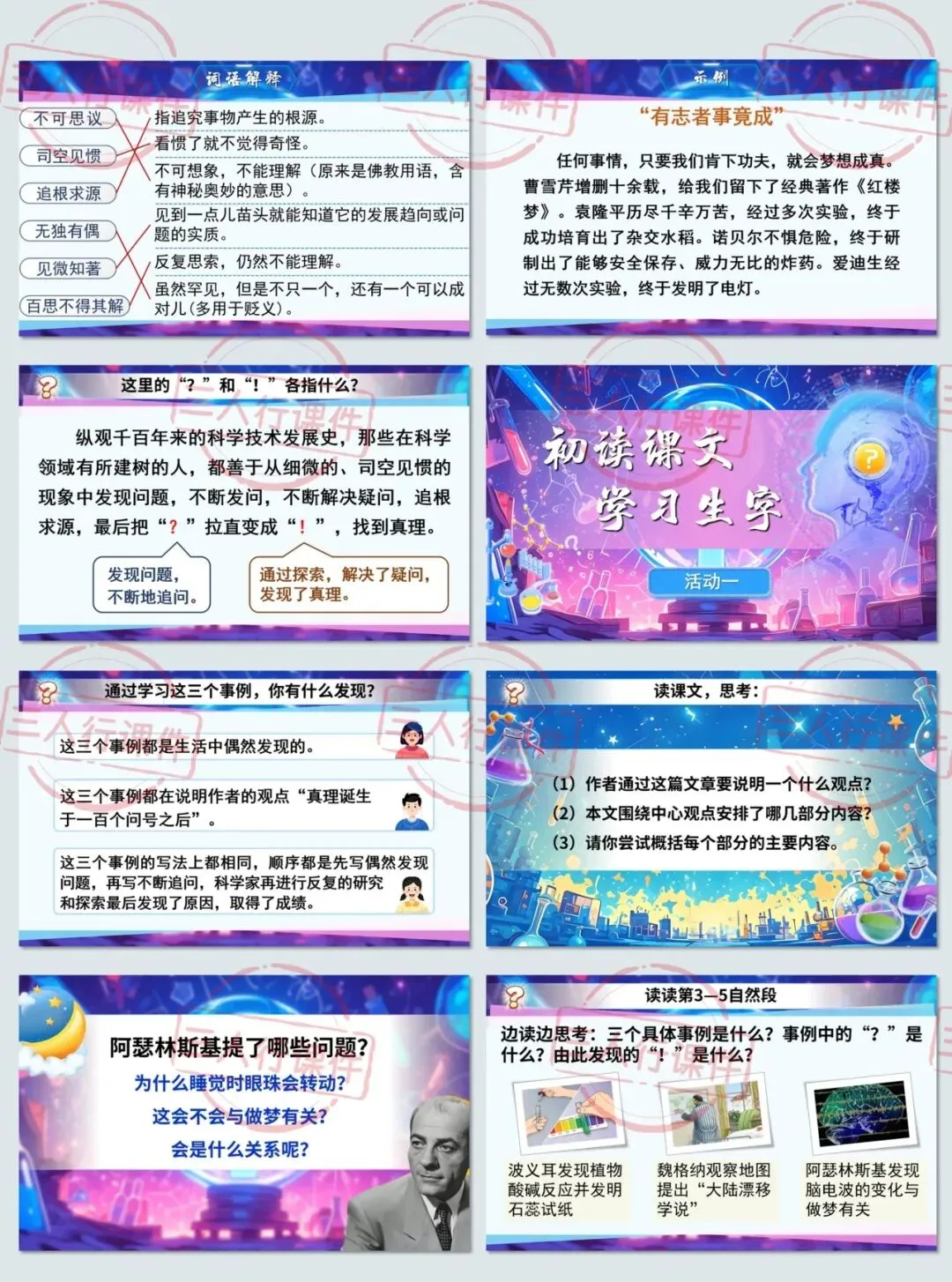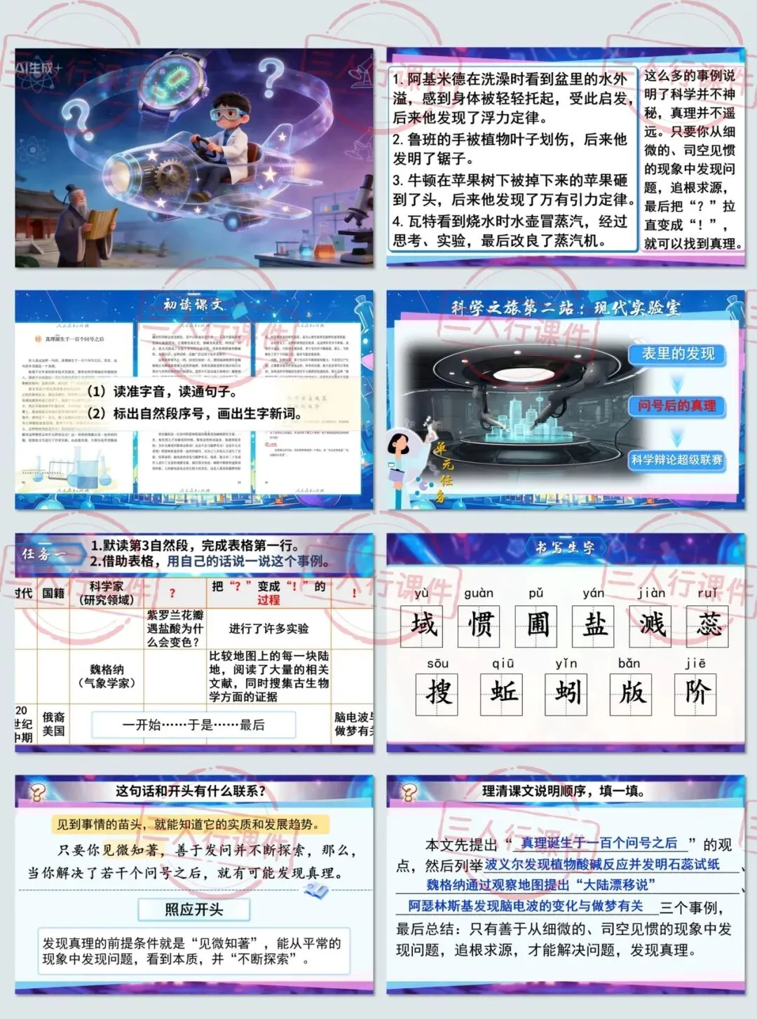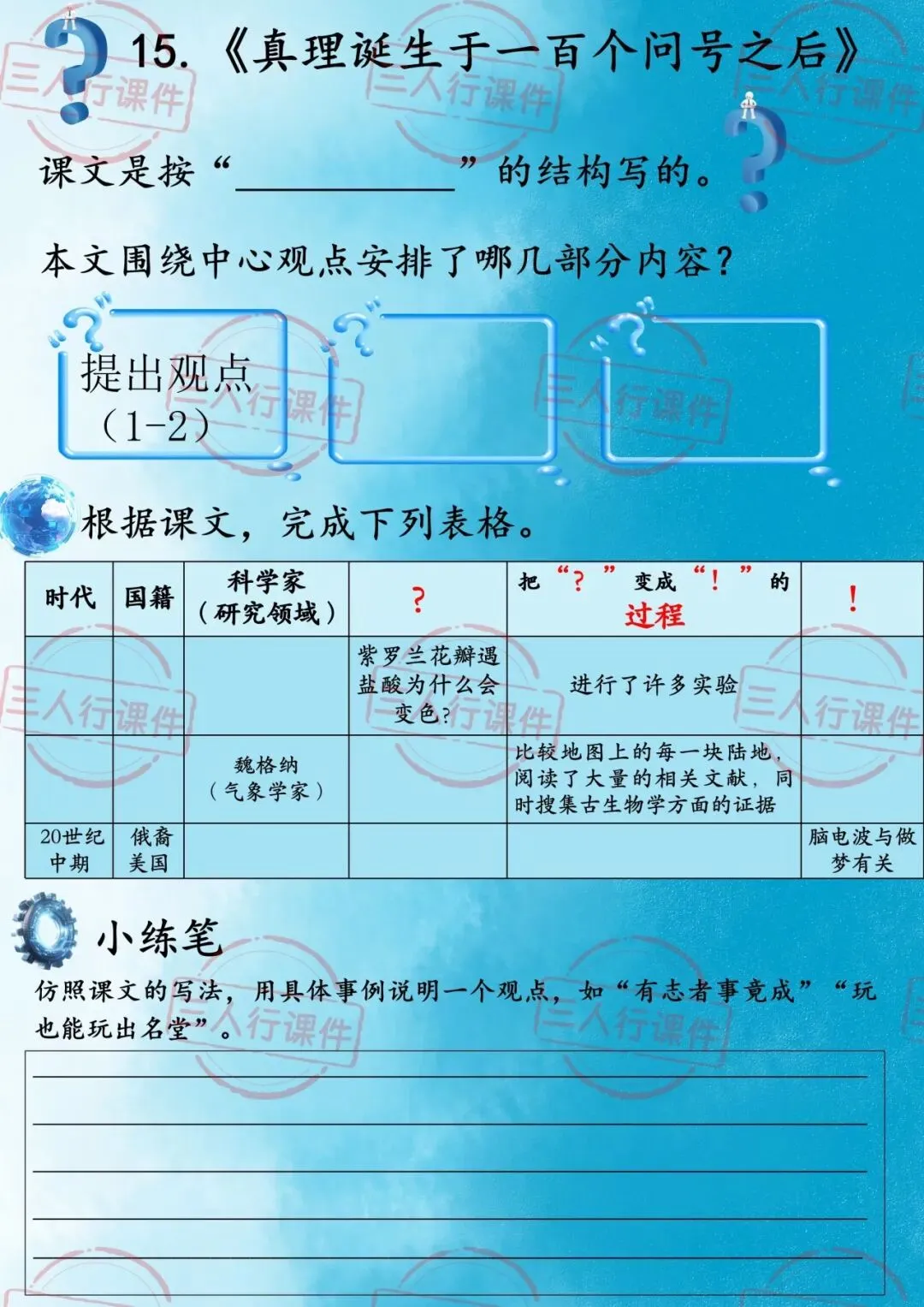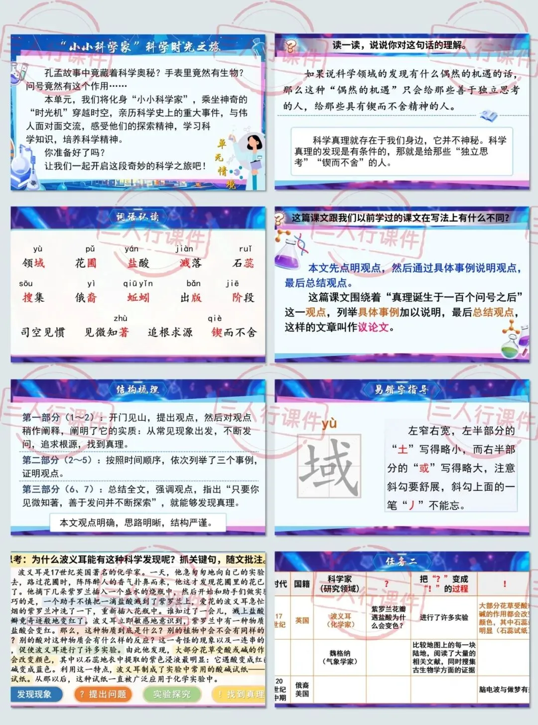 《真理诞生于一百个问号之后》是部编版小学语文六年级下册第五单元的课文。本单元以“科学探索”为主题,旨在培养学生科学精神和探索精神。本文是一篇议论文,作者叶永烈通过三个科学发现的具体事例,阐述了“真理诞生于一百个问号之后”这一观点,强调了科学家们善于从细微现象中发现问题、不断探索的精神。文章结构清晰,逻辑严谨,对学生进行科学思维训练和写作方法指导具有重要意义。